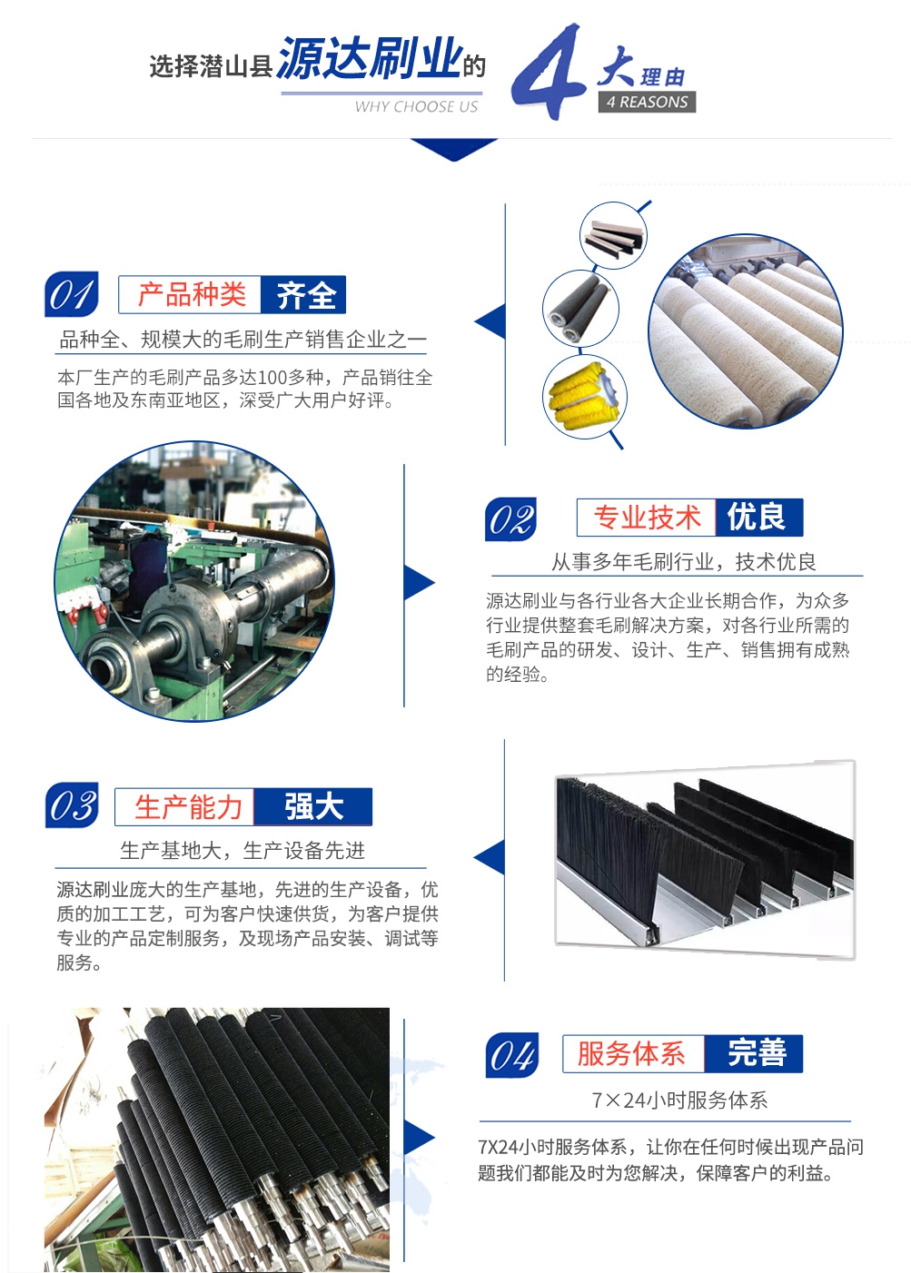 潛山縣源達刷業有限公司坐落于中國刷業基地---安徽省潛山縣源潭工業園區。本廠現有工業刷2000余種,主要生產工業機械用毛刷、毛刷輥、圓盤刷、皮帶刷、條刷、鋼絲刷、管道刷、板刷、環衛刷、橡膠輥、海綿吸水輥、針輥、異性毛刷等。
